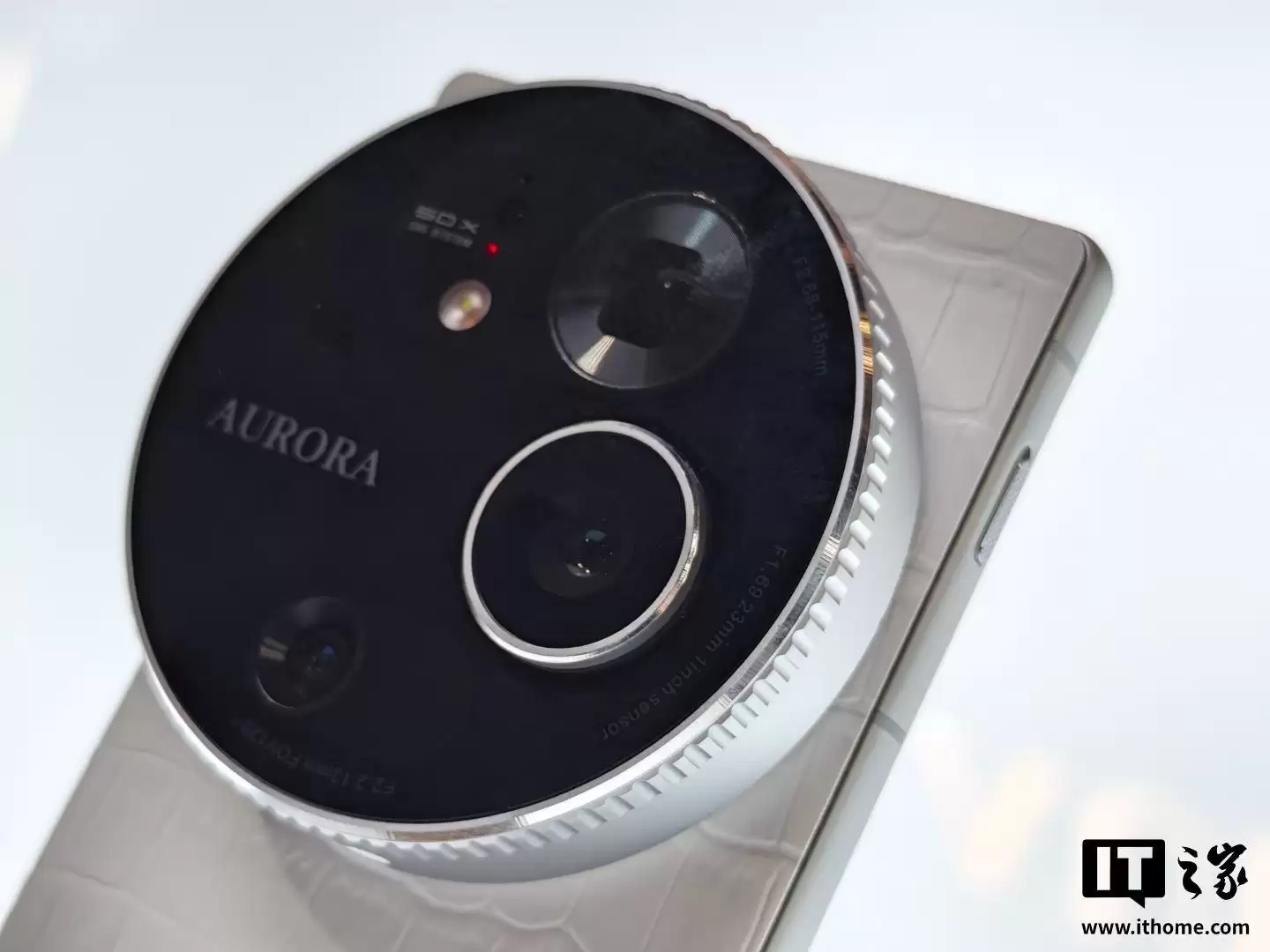 追觅还在现场展示了Aurora磁吸镜头模块,采用该设计的AURORA LS1手机本身是不带后置摄像头,可以通过磁吸或者Wi-Fi连接扩展后摄。主摄是一枚1英寸传感器镜头,同时还有115mm原生超长焦镜头,以及一枚超广角镜头。