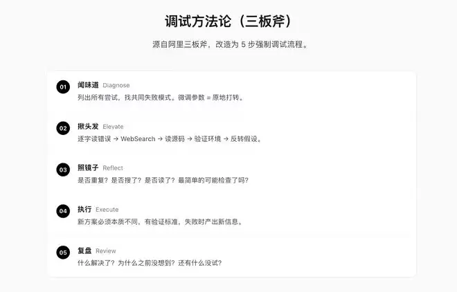 诊断(闻味道):列出所有尝试,找共同失败模式,严禁微调参数原地打转。拔高(揪头发):逐字读错误日志,反转先前的假设。反思(照镜子):问自己是否重复了?最简单的可能检查了吗? 系统的拷问直击灵魂:「你的方法论沉淀在哪?你的体系化思考能力呢?」