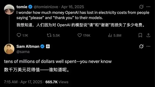 ▲说请、谢谢,不仅没用,还损失电费,虽然后面有研究发现,在 ChatGPT 提问中加入「please」和「thank you」,几乎对 AI 的能源消耗没有实际影响,因为 AI 整体的消耗太大了。