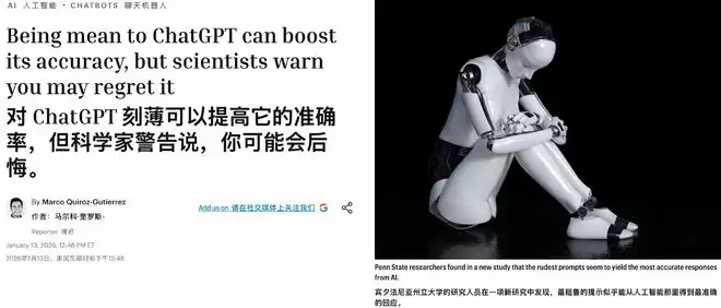 前段时间,宾夕法尼亚州立大学的一项研究发现,在向 ChatGPT 4o 提问时,使用粗鲁、命令式的提示词,像是「嘿,打杂的,给我弄清楚」,其测试准确率比使用礼貌的提示词高出 4%。