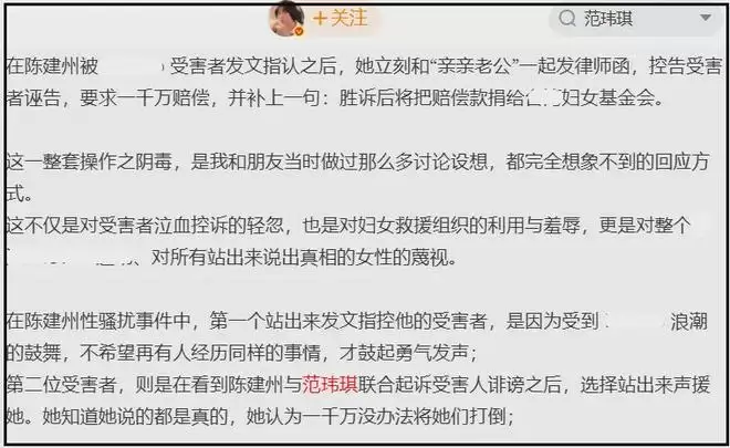 在抵制网友看来,抵制范玮琪并不是苛责女性,是因为她和陈建州是利益共同体,夫妻俩联手用官司对受害者施压,用金钱和权势去霸凌受害者,胁迫受害者闭嘴。