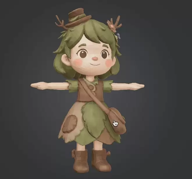 一位森林精灵角色,身穿树叶服饰,脚踩靴子,背着小挎包。