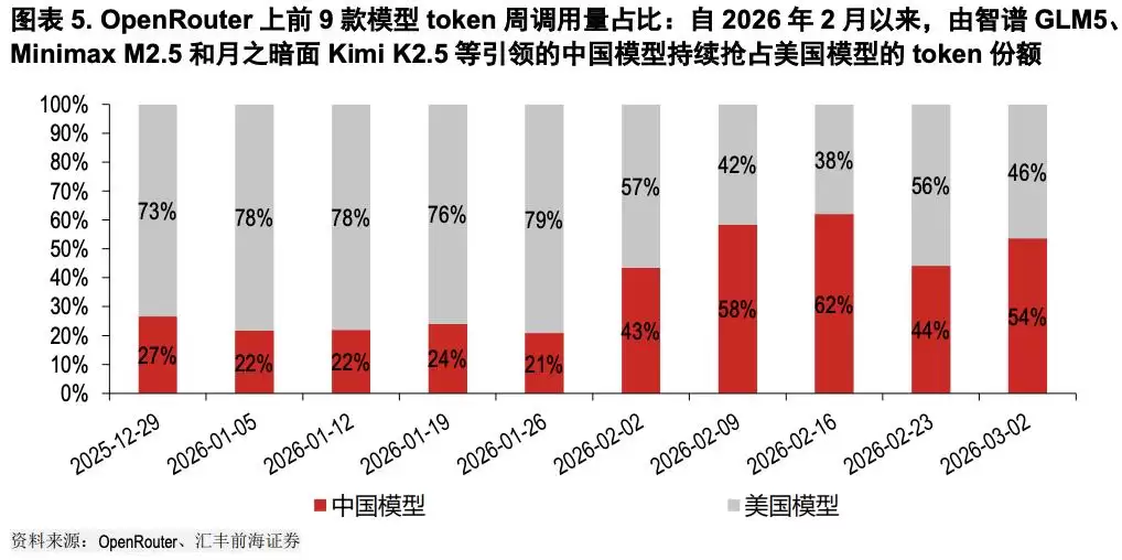 汇丰前海证券指出,自今年2月以来,智谱GLM-5、Minimax的M2.5、月之暗面的Kimi K2.5等中国大模型,凭借在性能与成本效益上的综合优势,持续抢占美国大模型的Token使用份额。
