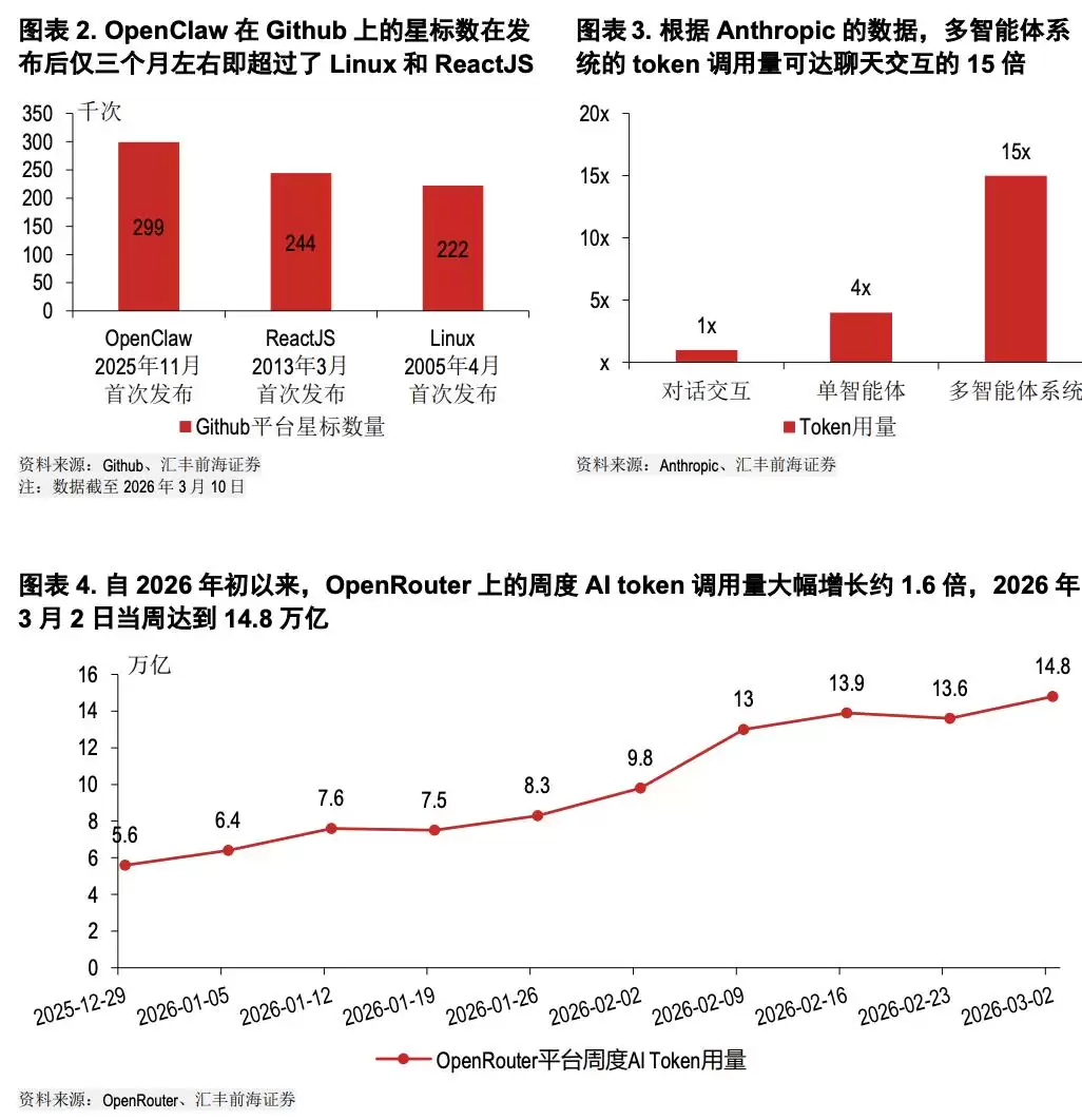 OpenRouter平台的数据进一步强化了这一趋势。汇丰前海证券指出,在个人用户与企业积极部署OpenClaw等多智能体系统的推动下,OpenRouter平台的周度Token调用量自今年初开始快速增长,并于3月2日当周达到了14.8万亿的水平。
