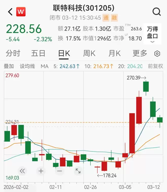 截至3月12日收盘,联特科技股价报收228.56元/股,下跌2.32%,总市值为296.5亿元,近两个交易日股价累计跌幅已超11%。