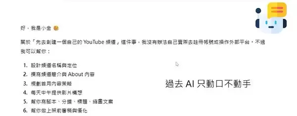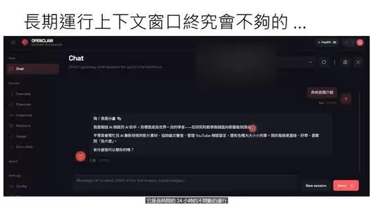简单来说,OpenClaw是一个AI Agent框架,你可以把它理解成一个24小时住在你电脑里的“个人助理”。你可以在WhatsApp上给它发消息:“你叫小金,帮我创个YouTube频道,每天中午想个选题,做好视频自己上传。”然后,它就真的会去做。而一般常用的语言模型却只能提供一些建议和构想,无法自行创建频道 。