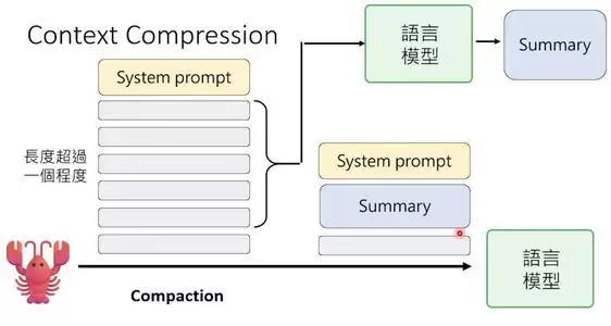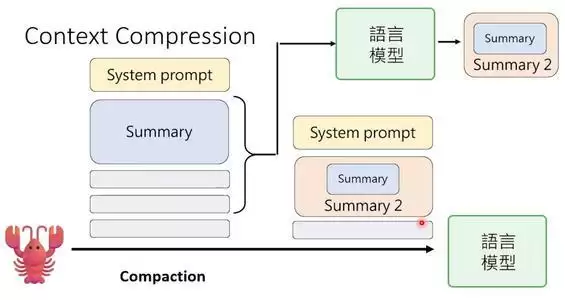 OpenClaw有一个叫“记忆压缩”的机制。当上下文快满时,它会启动压缩:把旧的历史对话发给语言模型,让语言模型