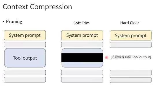 还有更暴力的方法,比如“软修剪”:把工具输出的长内容只保留开头和结尾,中间用省略号代替。或者“硬清除”:直接把工具的输出换成一句话“这里曾有一段工具输出”。