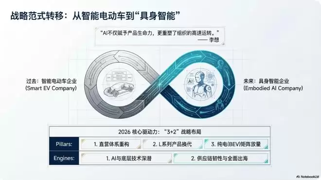 李想进一步指出,2026年是理想汽车进化为“具身智能企业”的关键之年。公司正通过组织架构调整与核心技术自研,加速从智能电动车制造商向人工智能企业的战略跃迁。