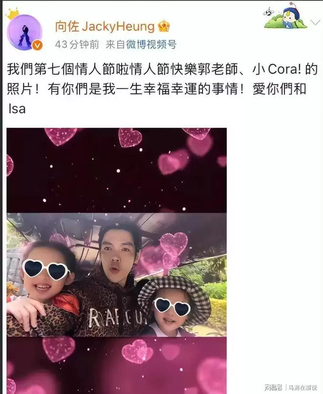 其实早在今年情人节的时候,向佐就用行动告诉了我们答案,情人节当天,向佐在在社交平台大方晒出一家四口游玩时拍的全家福,言语肉麻表达爱意。