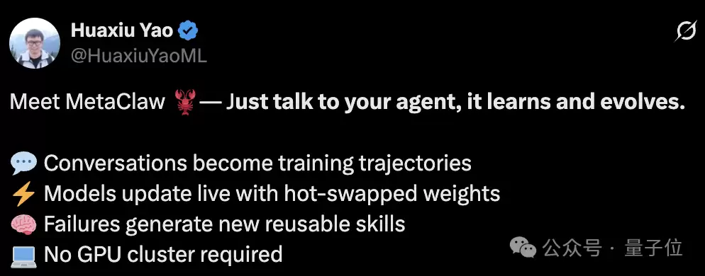 MetaClaw这项工作由姚莫诩领导,他是电子科技大学校友,现任UNC计算机科学系的助理教授,曾在Stanford AI Lab从事博士后研究,专注于智能体和具身AI。