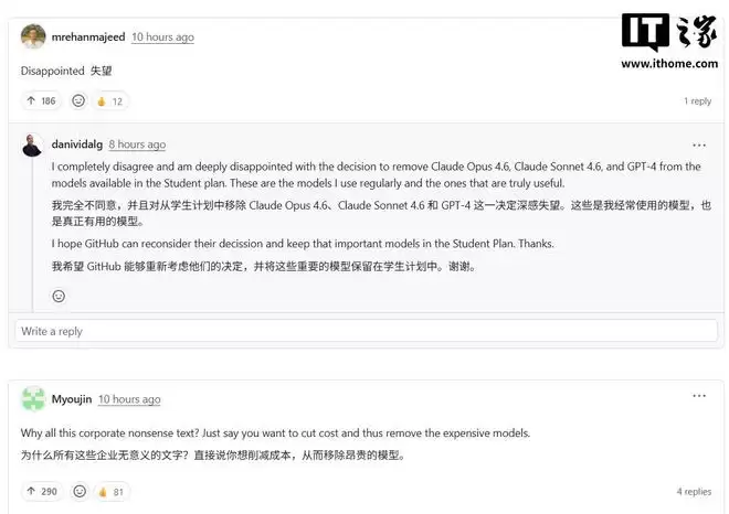 IT之家注意到,最新公告下方涌现大量用户表达失望之情,认为GitHub此举旨在控制运营成本,学生版Copilot计划当前提供的功能已与面向所有人的免费版本趋于一致。