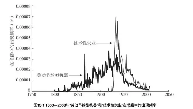 说到这段历史,需要提及一个关键词叫“技术性失业”,用来描述劳动节约型发明带来的影响。该词最早出现在1917年,直到10年后的1928年才呈现出流⾏上升趋势,并在20世纪30年代激增,在⼤萧条最严重的1933年达到了最⾼点。新术语的出现,让劳动节约型机器的旧叙事焕发活力。
