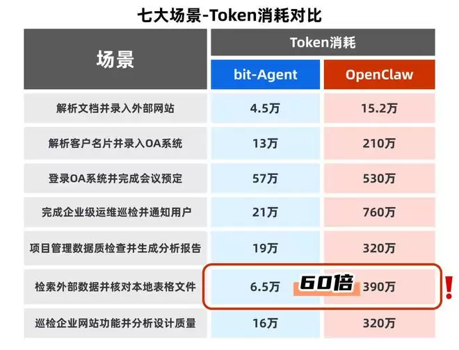 bit-Agent与OpenClaw在单个任务上的token消耗差距巨大,在「检索外部数据并核对本地表格文件」中,甚至相差了60倍