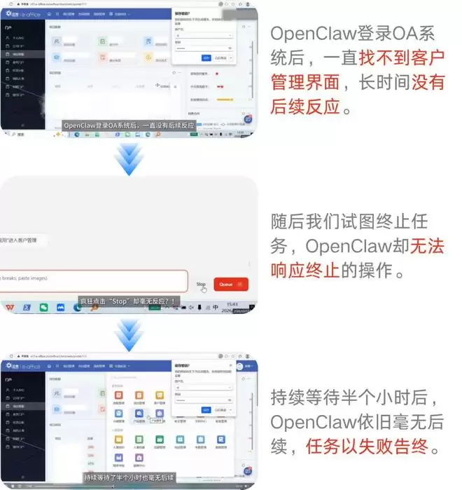 我们判断这是由于OpenClaw多模态数据处理与复杂GUI精准操作能力不足,无法支撑图像识别、表单录入等高要求任务。其缺少异常容错与流程重试机制,一旦环节执行失败就会直接卡死宕机,无法完成复杂业务操作。