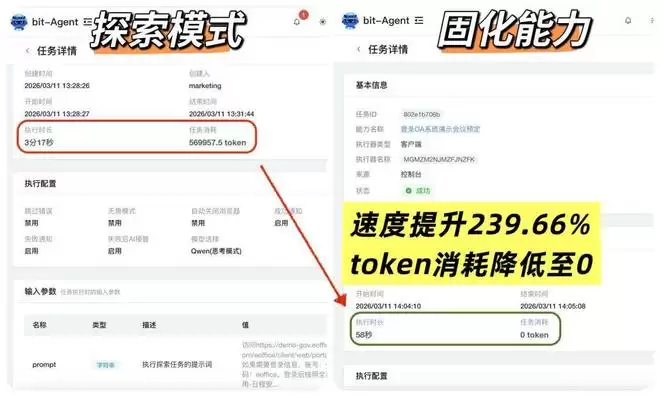 bit-Agent在使用“固化能力”后,token消耗降低为0,执行速度也提升了3倍在高频且大批量的任务中,这种改进带来的降本效果将被无限放大。