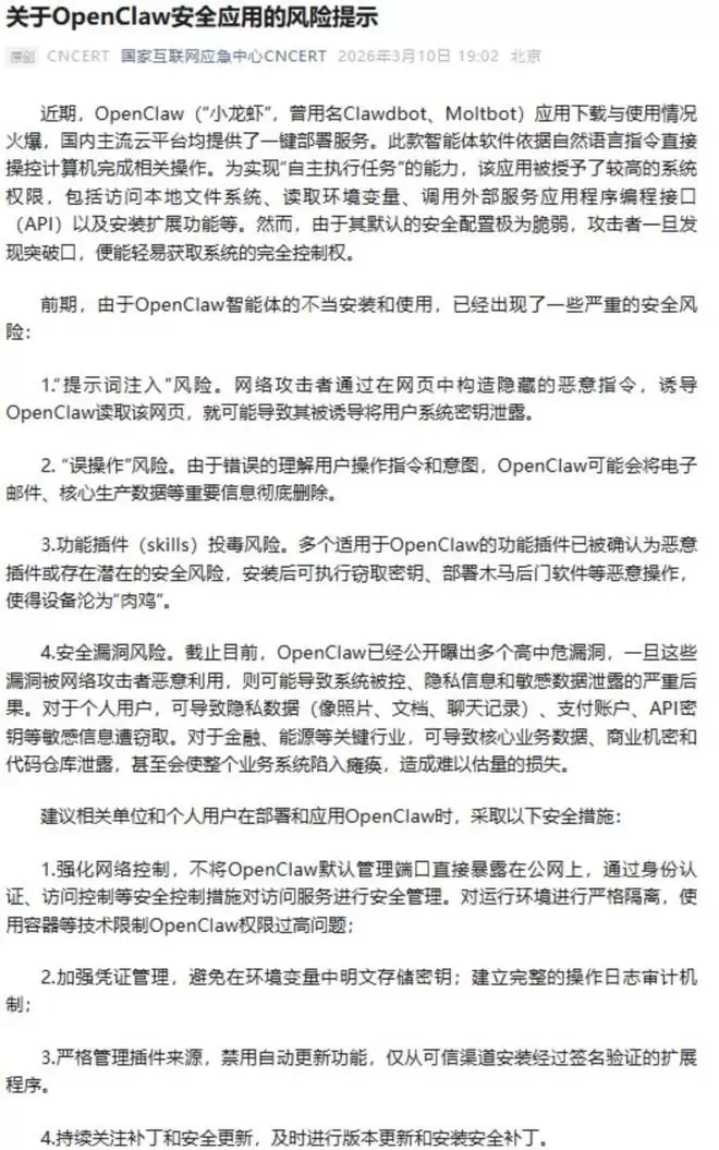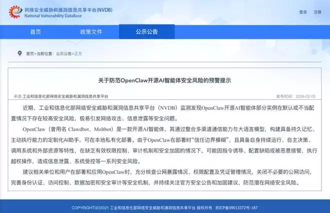 工信部与国家互联网应急中心先后发布关于OpenClaw的安全风险提示
