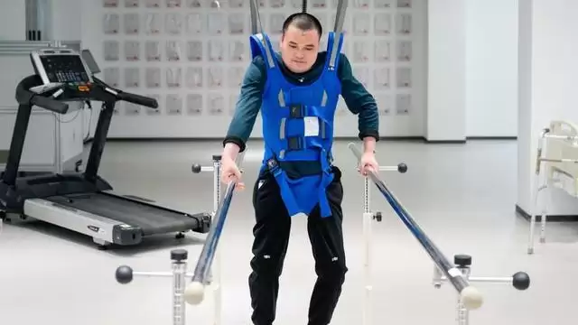 全国首例脑脊接口受试患者小林在进行康复训练。