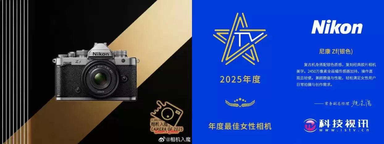 尼康Zf银色版则以经典胶片时代相机的设计语言为灵感,将金属机身质感与现代影像技术相融合,获得了相机入魔“年度白月光”及科技视讯“年度首选女性相机奖”等奖项。