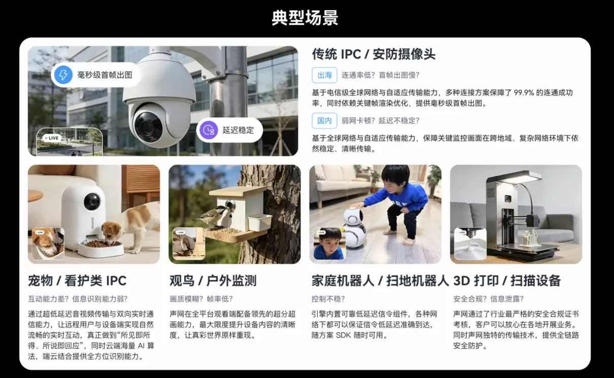 针对物联网设备的连接痛点,声网同步推出的泛IPC解决方案提供四大核心能力:依托自研SD-RTN™网络实现的全覆盖,确保东南亚等网络薄弱地区设备激活成功率超99.9%;专利编解码算法在80%丢包环境下仍保持流畅传输;端云协同AI架构支持宠物检测、行为分析等场景算法的云端加载;多端互通技术突破传统P2P方案的人数限制,同时满足全球合规要求。这些能力组合,精准解决了摄像头、扫地机器人等设备的实时交互难题。