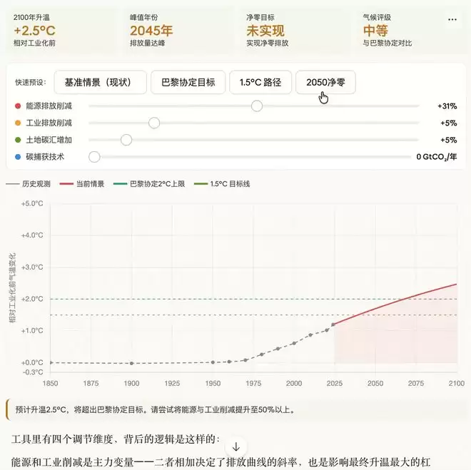 提示词:生成一个工具,让用户改变温室气体排放量,观察未来气温变化趋势。