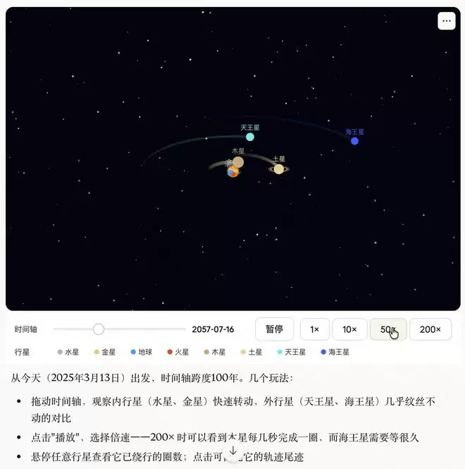 提示词:创建一个交互式太阳系模型,让用户拖动时间轴观察行星轨道如何随时间变化。