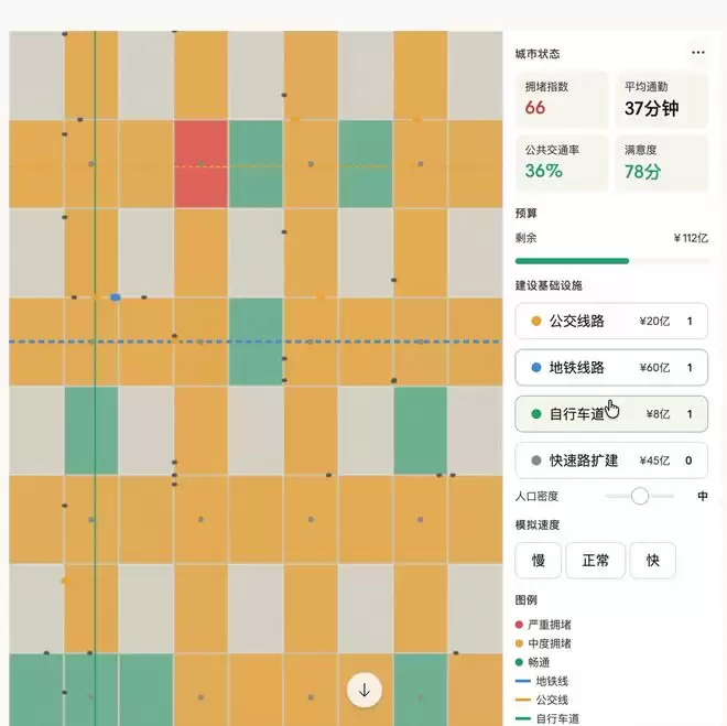 提示词:做一个城市交通模拟器,让用户增加公交、地铁或自行车道,观察交通拥堵如何变化。