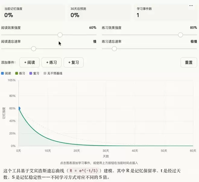 提示词:生成一个工具展示不同学习方式(阅读、练习、复习)如何影响记忆曲线。