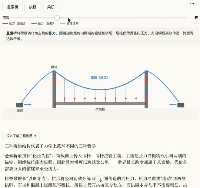 提示词:展示不同桥梁结构(悬索桥、拱桥、梁桥)如何分散重量。