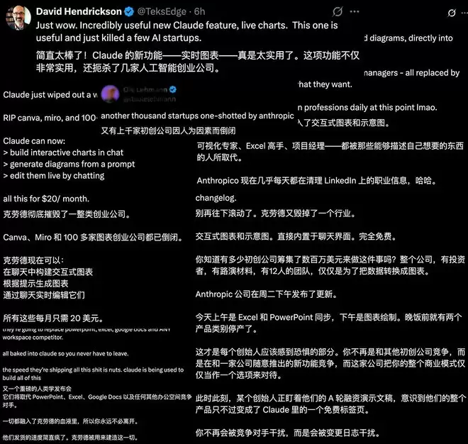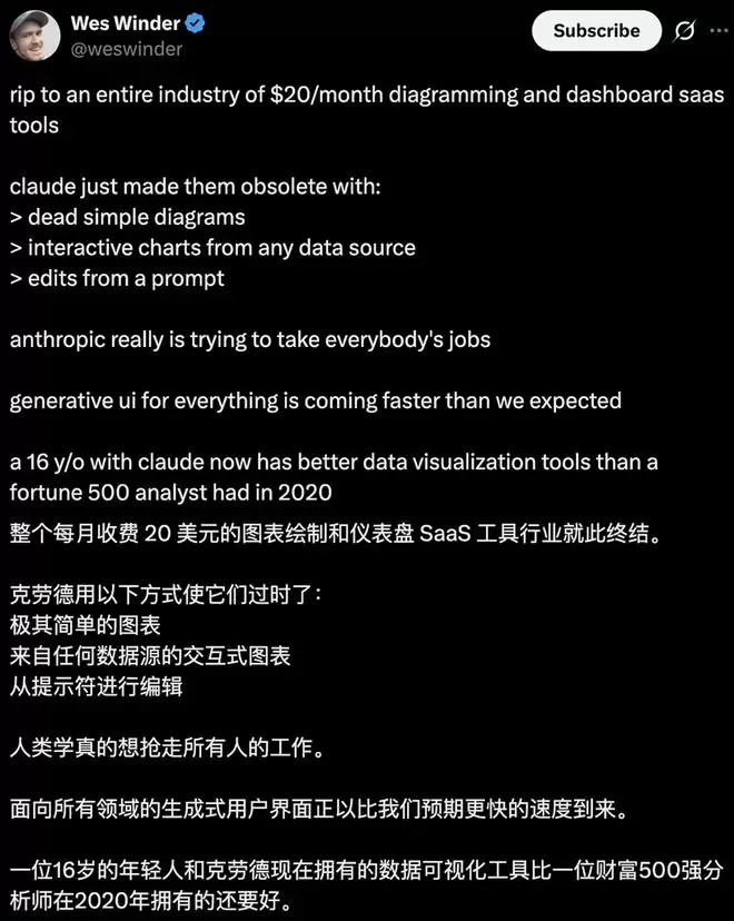 “Anthropic真的想抢走所有人的工作。”X平台上排名第一的氛围编程社区创始人Wes Winder评论说,“每月收费20美元的图标绘制和仪表盘SaaS工具行业就此终结,Claude让它们过时了……一位16岁年轻人和Claude现在拥有的数据可视化工具,比一位财富500在2020年拥有的还要好。”