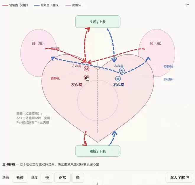 提示词:生成一个交互式人体心脏循环示意图,展示血液如何流动。