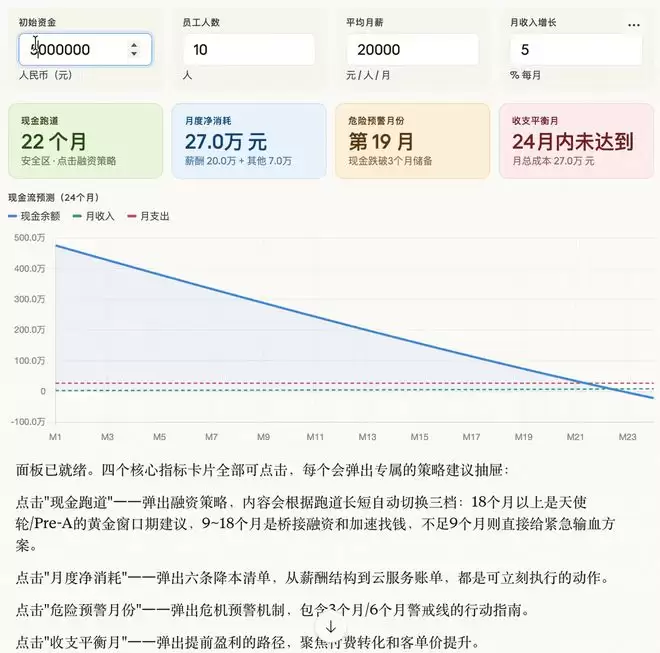 提示词:帮我建立一个“初创企业生存压力测试面板”。允许我输入初始资金、员工人数、平均薪资和月增长率。请实时生成一个动态仪表盘,显示我的‘现金流耗尽倒计时’,并用颜色预警风险。点击仪表盘的不同区域,要能弹出针对性的‘省钱建议’或‘融资策略’。