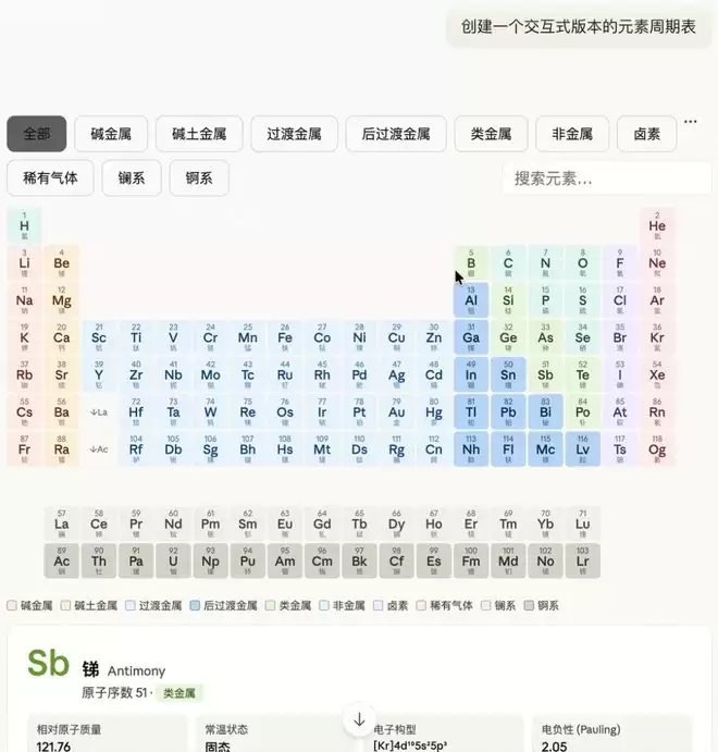 在Claude聊天框中输入“创建一个交互式版本的元素周期表”,Claude能输出一张会动的元素周期表,点击任一元素,下方会出现对应的详细信息。