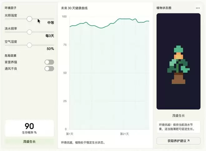 提示词:我想在家里养植物,请做一个交互式的‘植物生存概率预测器’。左侧让我选环境因子(光照强度、浇水频率、湿度、是否养猫),中间用动态图表显示这盆植物未来30天的‘健康曲线’,右侧根据我的选择实时生成一张像素风的植物状态图(枯萎、茂盛或被猫吃掉)。