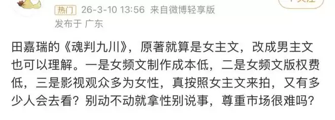 要么就倒打一耙,搬出“女频文制作成本低、版权费便宜、影视观众多为女性,改成大男主才更有市场”这套歪理,把赤裸裸的性转掠夺,包装成“尊重市场”的合理选择。