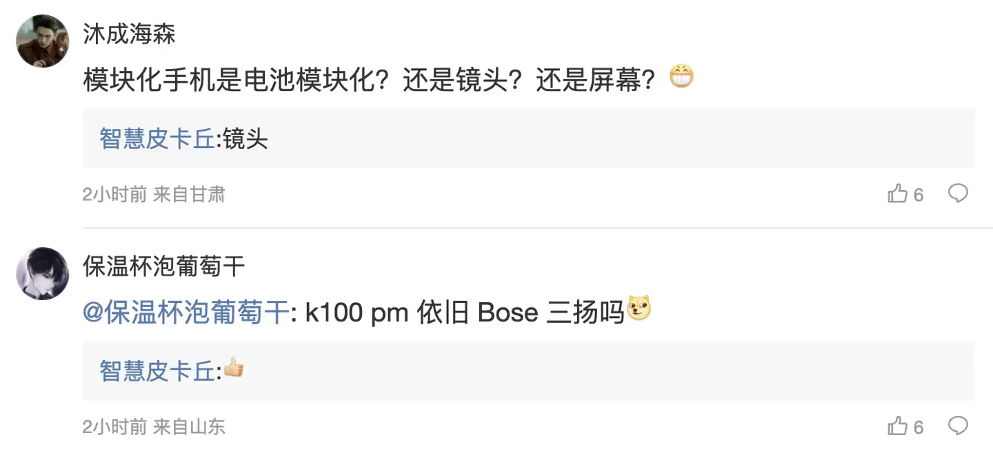 随后有用户在评论区询问:“模块化手机是指电池模块化?镜头模块化?还是屏幕模块化?”博主回复确认是“镜头”;另一用户则追问:“k100 pm是否依旧采用Bose三扬声系统[狗头斜眼]”,博主以[大拇指]表情予以肯定。