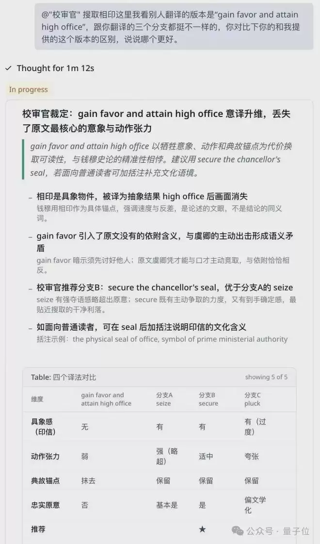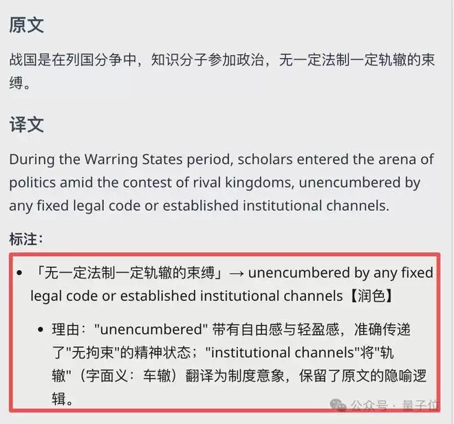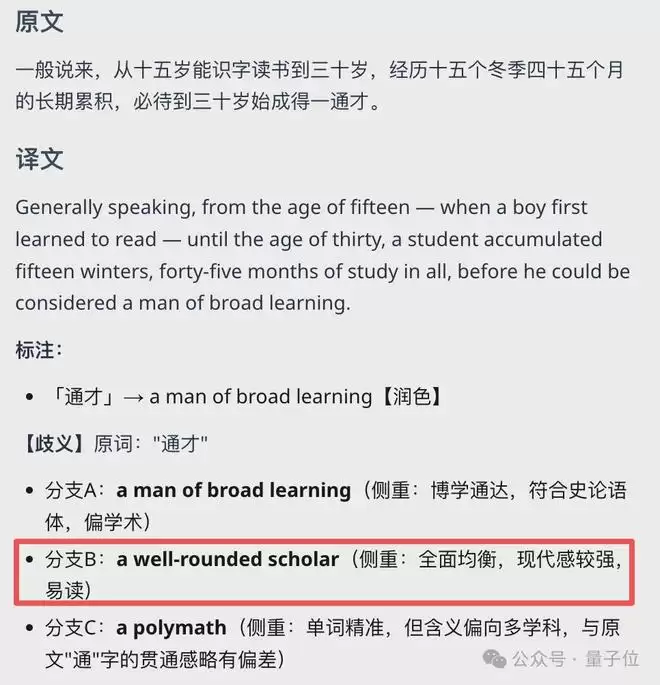翻译得够不够信达雅咱先不说,至少看上去它是诚实的——逐段进行拆分,会把它为何选择这么翻译的思路,清晰展示出来:
