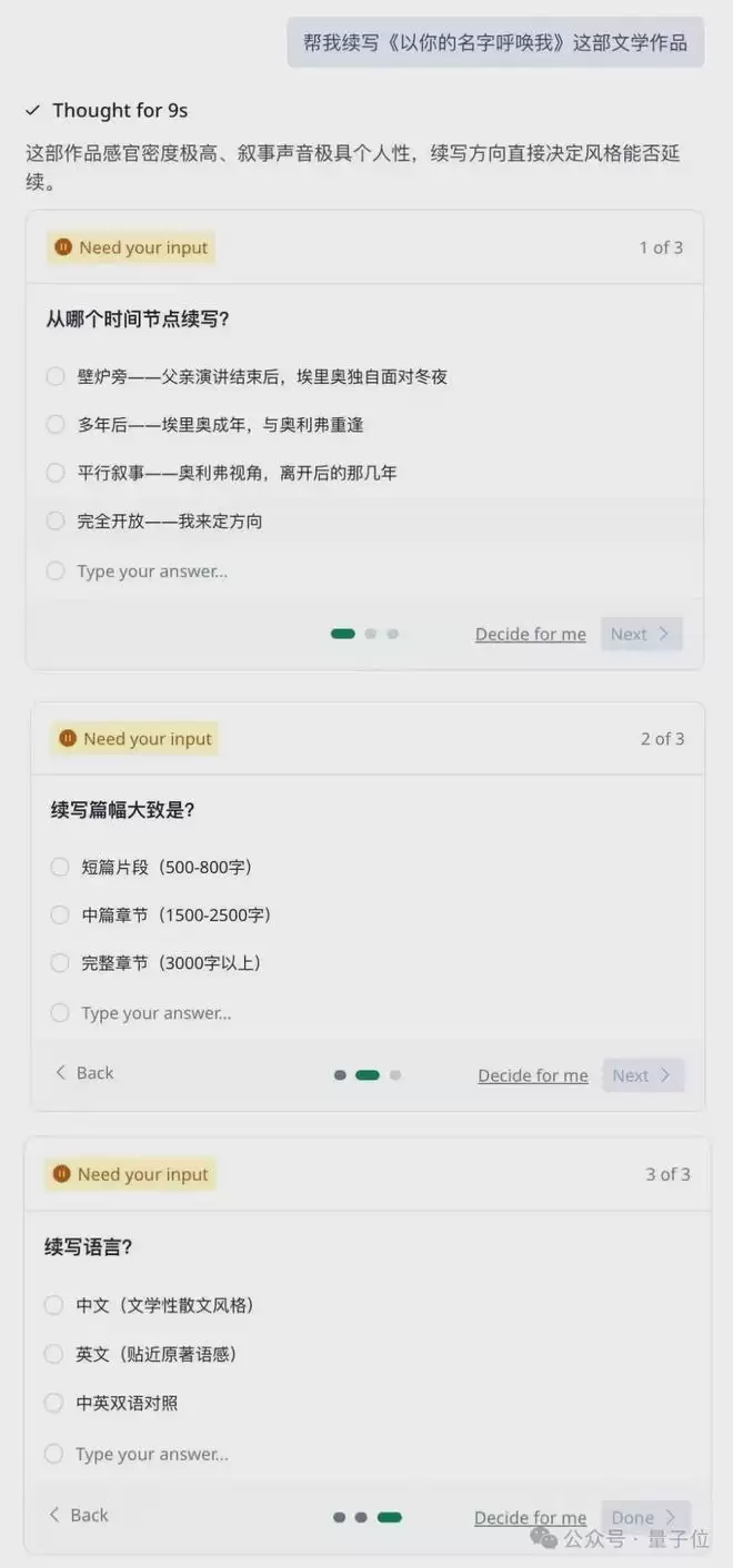 因为是突然心血来潮,我脑子里对细节残存的记忆也不多了,它竟然会主动问询我从哪个时间节点开始续写、续写的篇幅字数、续写时想要使用的语言。