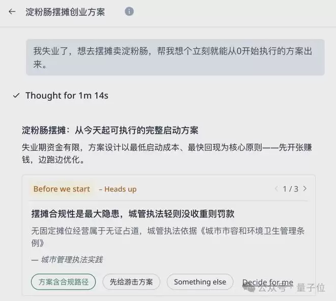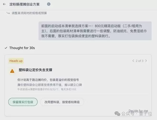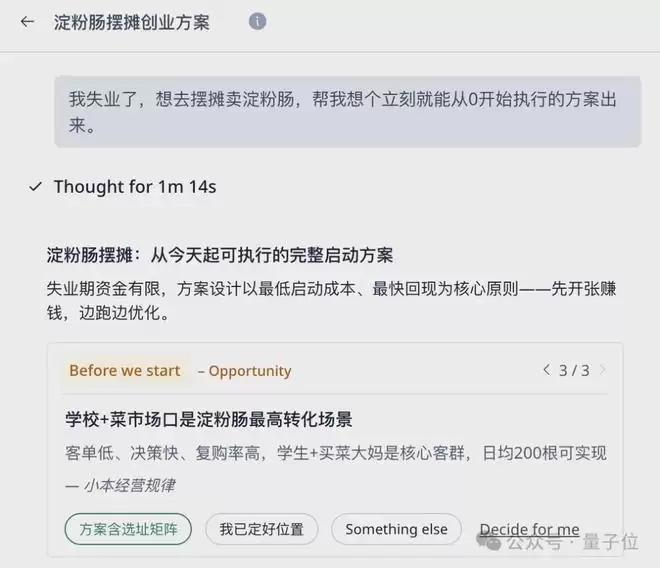 在哪里摆摊卖呢?我一头雾水,所以希望它给我的方案包括选址的决策逻辑。但如果你很有主见,预先就想好了摆摊地点,就可以明确告诉它大方向。