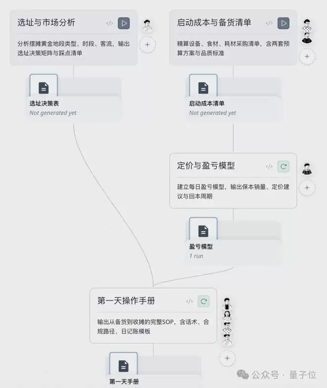 几个员工这么一顿忙活下来,再加上我的及时纠偏和确认,直接整出来一个包含选址决策、启动成本清单、定价与盈亏模型、第一天SOP的完整创业手册。