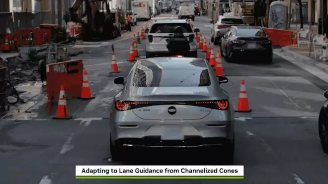 此次视频全程是从伍德赛德行驶到到旧金山市中心,期间经历了施工区域,违停车辆处理,自主变道博弈和突发情况绕行等情况,英伟达的辅助驾驶系统处理的十分流畅。