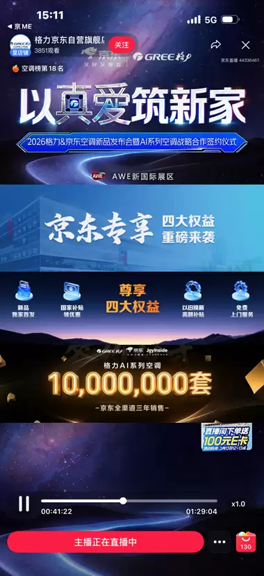 3月12日至15日,在2026年中国家电及消费电子博览会(AWE 2026)举办期间,京东重磅推出“总裁+明星”双矩阵系列直播活动,打造了一场融合科技趋势、明星互动与超级福利的线上盛宴,持续放大行业声量与消费热度,助力用户高效锁定心头好物。