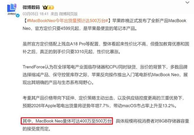 最近托尼刷微博的时候,发现一个挺魔幻的事 ——就是 MacBook Neo 居然卖爆了?!
