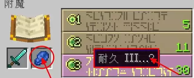 最后一步,打开附魔台界面,放入钻石剑和青金石。青金石能为物品附加一条随机属性,将鼠标移动到附魔结果上即可预览本次附魔的具体属性。