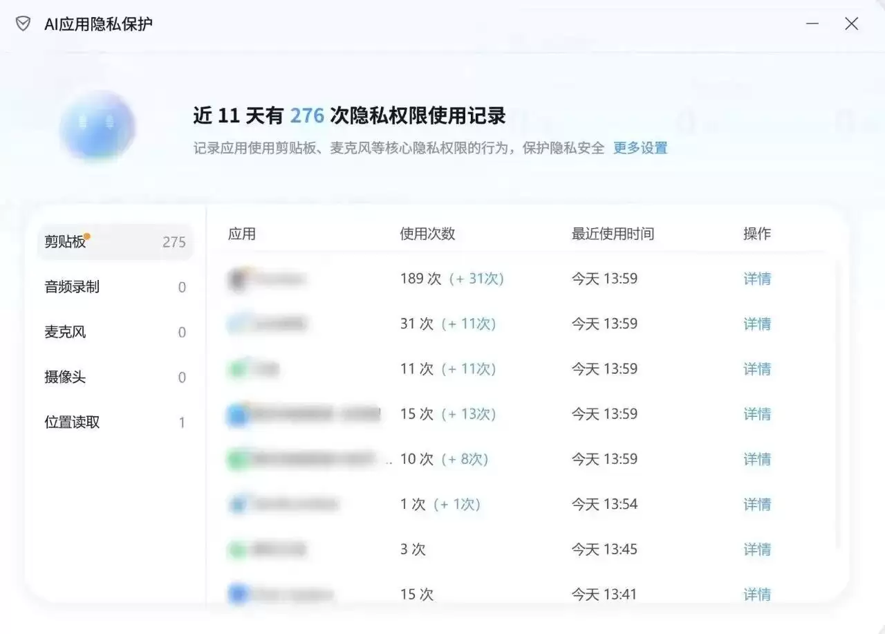 点击“详情”页面,还可进一步查看具体调用记录,并识别该权限调用是由用户主动触发或软件自动调用,帮助用户更好地识别潜在风险,提升AI应用使用的透明度与安全性。