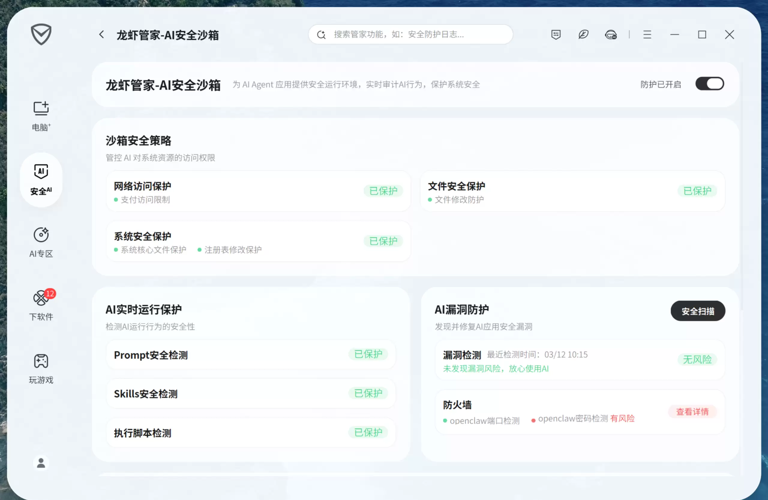 支持发现并修复AI应用安全漏洞,可开启定时漏洞扫描,并监测AI应用端口暴露及网关密码安全,防止未授权访问。