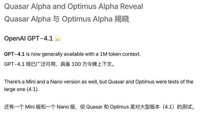 后来,OpenRouter最新确认Quasar Alpha和Optimus Alpha都是GPT-4.1的早期测试版本。