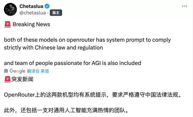有人称,Hunter Alpha和Healer Alpha的系统提示里都包含一句要求:严格遵守中国法律法规。