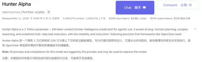 Hunter Alpha,1万亿参数,100万token上下文,专为Agent使用而构建的前沿智能模型。