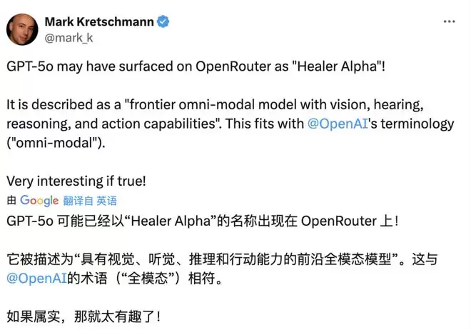 他发现Healer Alpha的描述里用了「omni-modal」这个词,而这个词是OpenAI的常用术语!